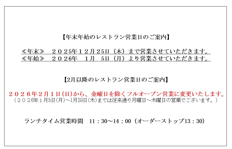 年末年始及び2月以降のレストラン営業日につきましては、下記によりご案内申し上げますので、